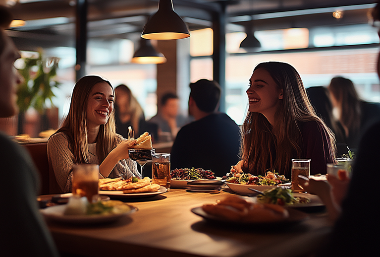 Café, barra, diseño cálido, terraza interior y mobiliario flexible.